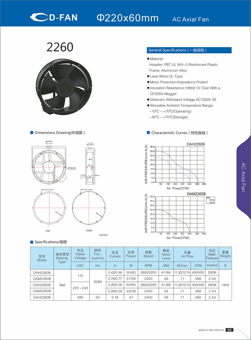 材料: 叶轮:PBT UL 94V-0增强塑料框架铝合金 导线:UL型 电机保护:阻抗保护 绝缘电阻:1欧姆或以上,带DC500V高阻表 介电耐压:AC1500V 3S 允许环境温度范围: -10℃-+70℃(运行) -40℃-+70℃(储存)